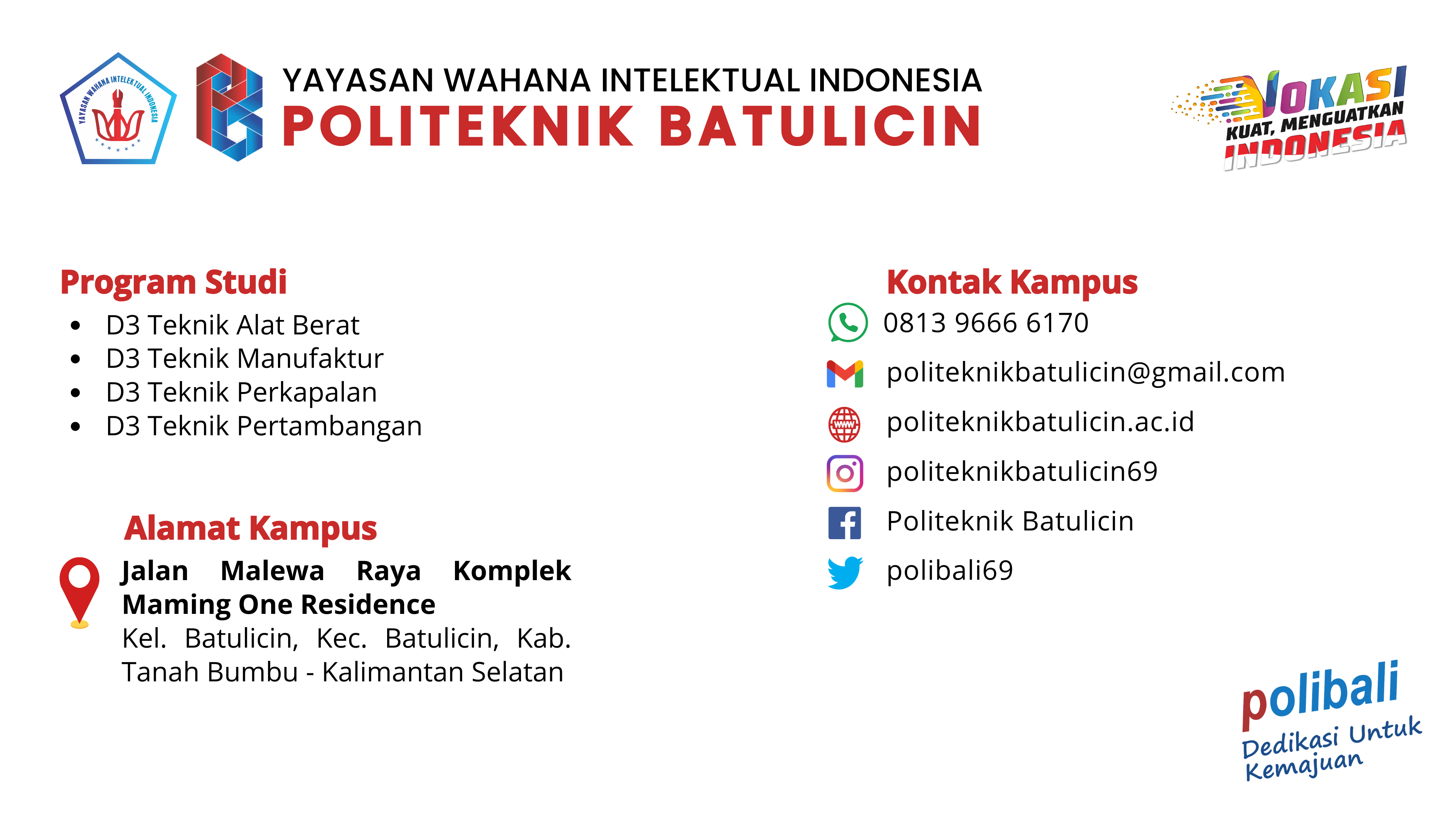 Politeknik Batulicin (Polibali) adalah perguruan tinggi vokasi swasta yang berlokasi di Kecamatan Batulicin, Kabupaten Tanah Bumbu, Kalimantan Selatan. Didirikan pada 21 Juli 2012 dan memperoleh izin operasional pada 27 November 2014. Polibali bertujuan menghasilkan lulusan terampil yang mendukung industri kreatif nasional melalui pendidikan vokasi, penelitian terapan, dan pengabdian kepada masyarakat. Kampus Polibali saat ini masih dalam tahap pengembangan sarana, seperti workshop dan fasilitas pendukung lainnya. Terdapat empat program studi yang ditawarkan, yaitu Teknik Manufaktur, Teknik Alat Berat, Teknik Pertambangan, dan Teknik Perkapalan.